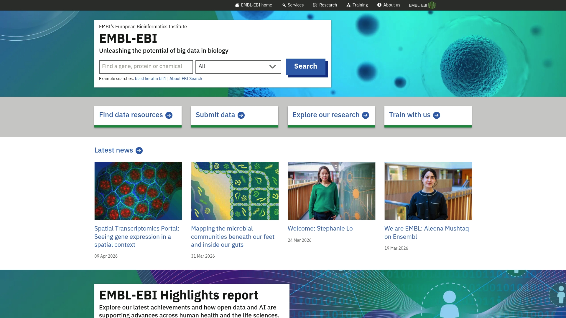 EMBL-EBI provides data resources and tools, data submission services, and long-term data preservation that help researchers store and analyze high throughput datasets. The institute also runs robust training and education programs and supports research groups with publications and method development.